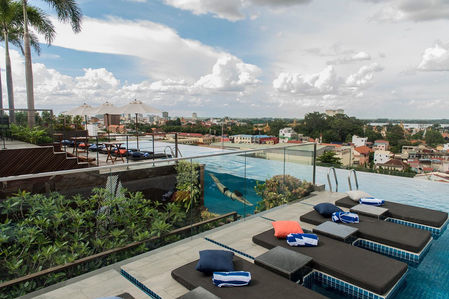 Perched on the roof of the Aquarius Hotel, this striking L-shaped infinity pool and its lush green sundeck provide sweeping views of the city. One section of the saltwater pool has a glass wall so that swimmers are visible as they pass.