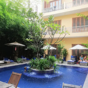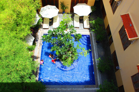 This is a small and shallow but very picturesque wading pool with an island of greenery in the center. There are sun umbrellas and trees for shade, and loungers and bean bag cushions to sink into.