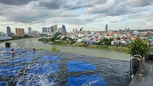 The infinity edge offers a stunning, unobstructed view of the Mekong, making for a pretty epic backdrop while you play. But the layout is family-friendly, featuring a dedicated shallow splash zone where the little ones can safely burn off steam while you keep a relaxed eye on them. It manages to strike that rare balance of being stylish enough for a getaway, yet spacious enough that you won't feel like you're "that family" making too much noise.